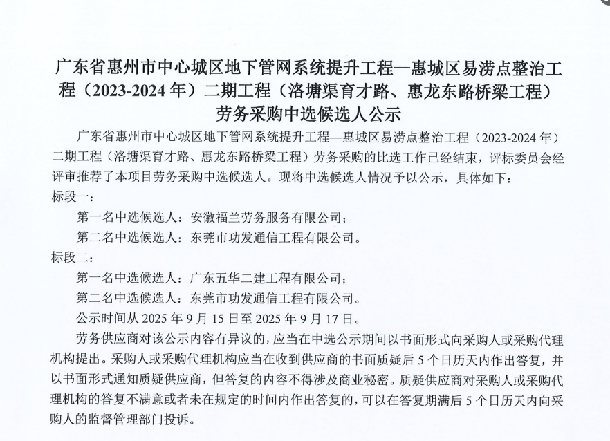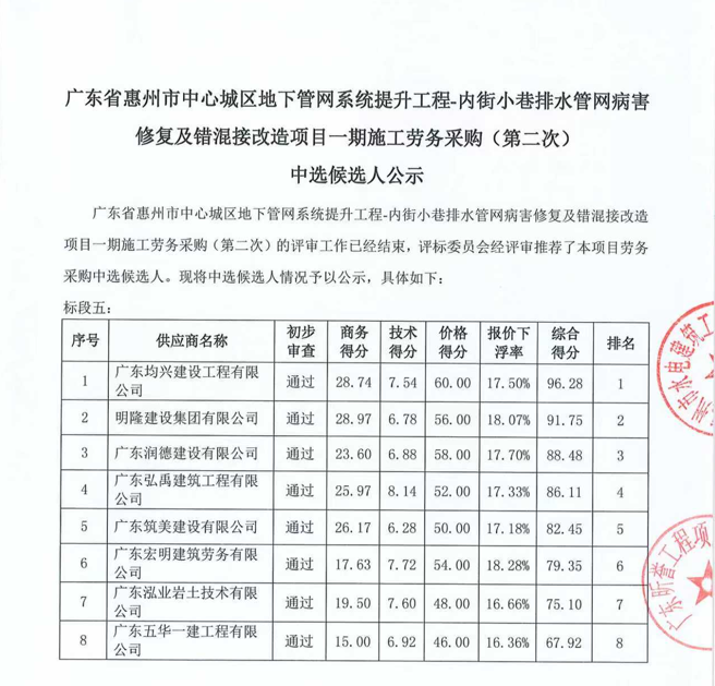 廣東省惠州市中心城區(qū)地下管網(wǎng)系統(tǒng)提升工程-內街小巷排水管網(wǎng)病害修復及錯混接改造項目一期施工勞務采購(第二次)中選候選人公示……